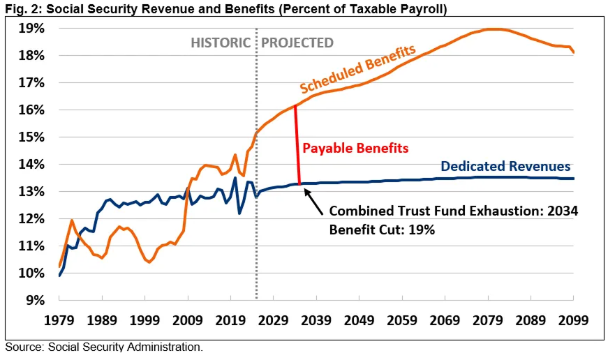 “Over the next 75 years, the combined Social Security trust funds face an actuarial imbalance of 3.82 percent of payroll, or 1.3 percent of GDP, the largest since 1977. A plan to restore solvency will require the equivalent of at least a 22 percent reduction in benefits for current and future beneficiaries, a 29 percent increase in payroll taxes, or some combination of the two. Because lawmakers have waited so long to act, neither eliminating the cap on wages subject to the payroll tax nor price-indexing the growth in initial benefits would be enough to restore solvency.” (Committee for a Responsible Federal Budget. (2025, June 18). Analysis of the 2025 Social Security Trustees’ Report)